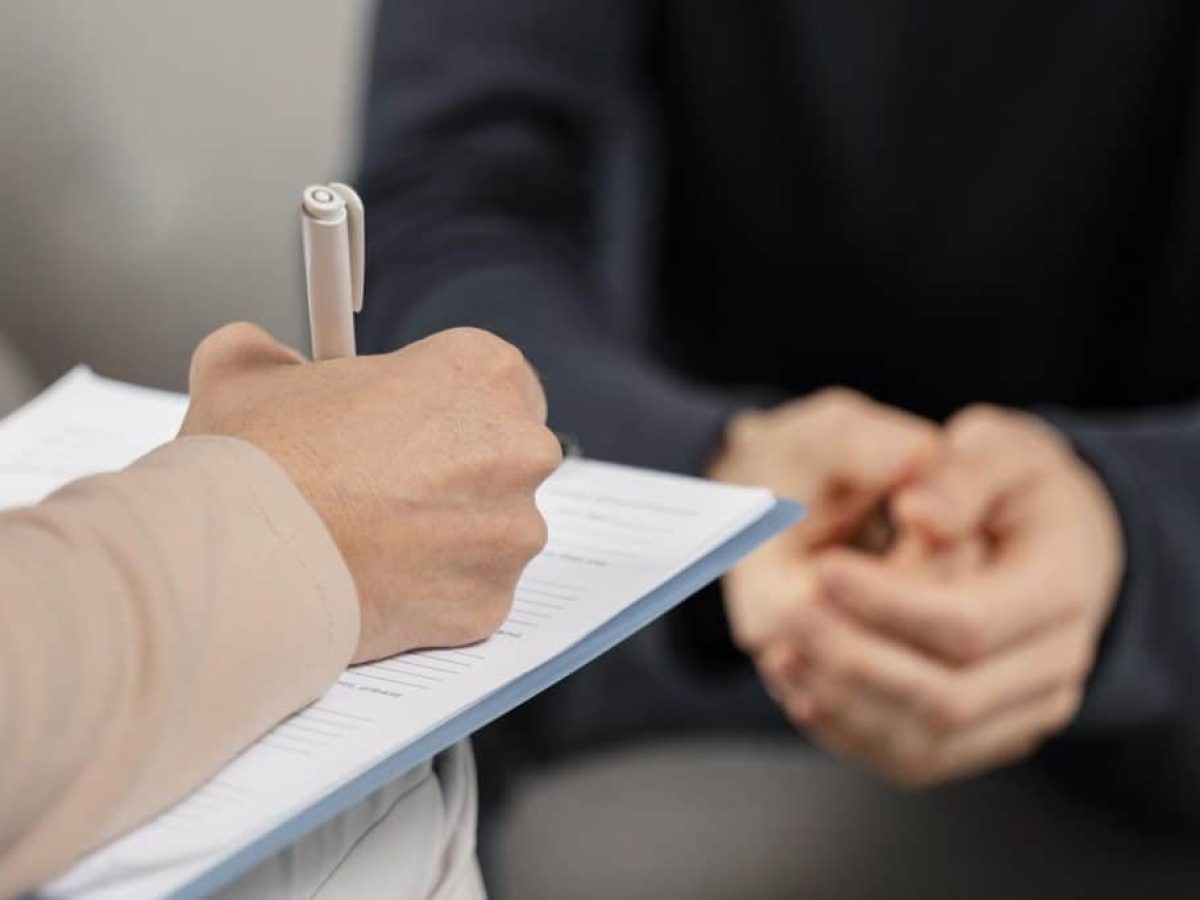 Κοντινό πλάνο στο χέρι μιας γυναίκας, πιθανότατα ψυχολόγου, η οποία φοράει ένα πορτοκαλί-καφέ σακάκι και κρατάει ένα στυλό και έναν πίνακα με κλιπ, παίρνοντας σημειώσεις. Τα νύχια της είναι βαμμένα μαύρα. Στο θολό φόντο, ένας άνδρας με λευκό t-shirt και τζιν κάθεται σε μια σκούρα καρέκλα, ακουμπώντας το χέρι του στο κεφάλι, πιθανώς να συζητά τα προβλήματά του.