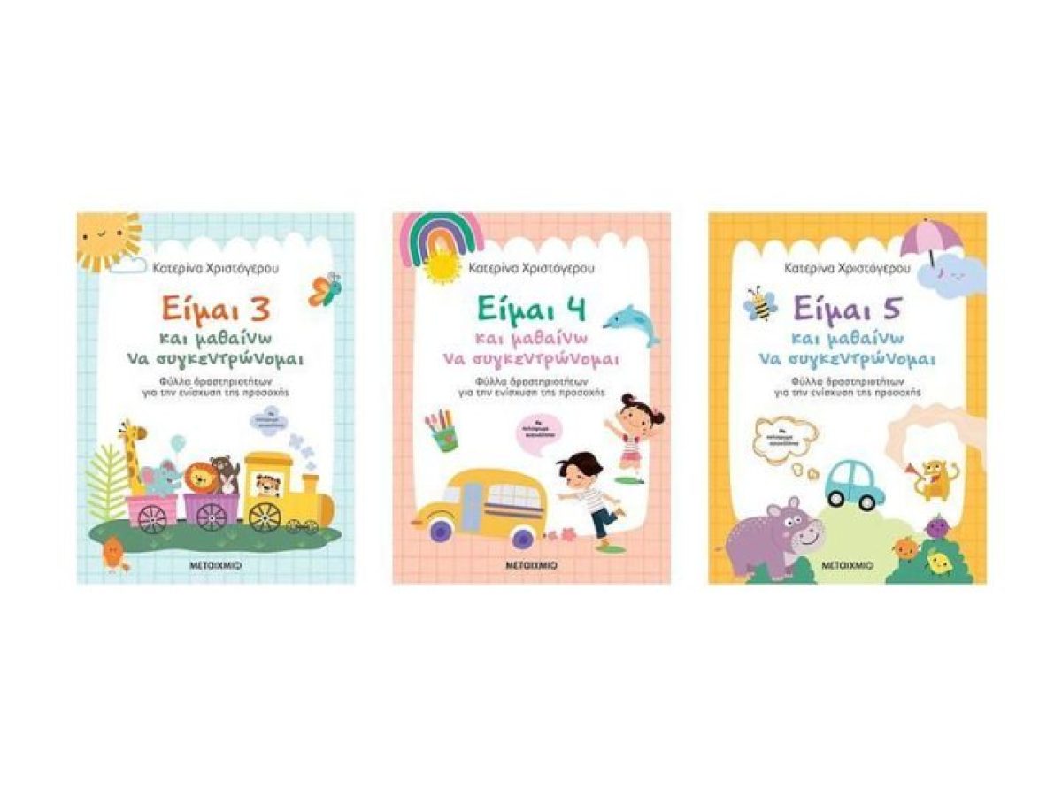 Σας προτείνω να ξεκινήσετε με τη στοχευμένη υποστήριξη που προσφέρουν τα τρία βιβλία: το «Είμαι 3 και μαθαίνω να συγκεντρώνομαι», το «Είμαι 4 και μαθαίνω να συγκεντρώνομαι» και το «Είμαι 5 και μαθαίνω να συγκεντρώνομαι». Κάθε τίτλος είναι σχεδιασμένος για την αντίστοιχη ηλικία και κοστίζει 8,91 € το κάθε ένα, καθιστώντας την επένδυση προσιτή και εύκολη στην επανάληψη στο σπίτι.
