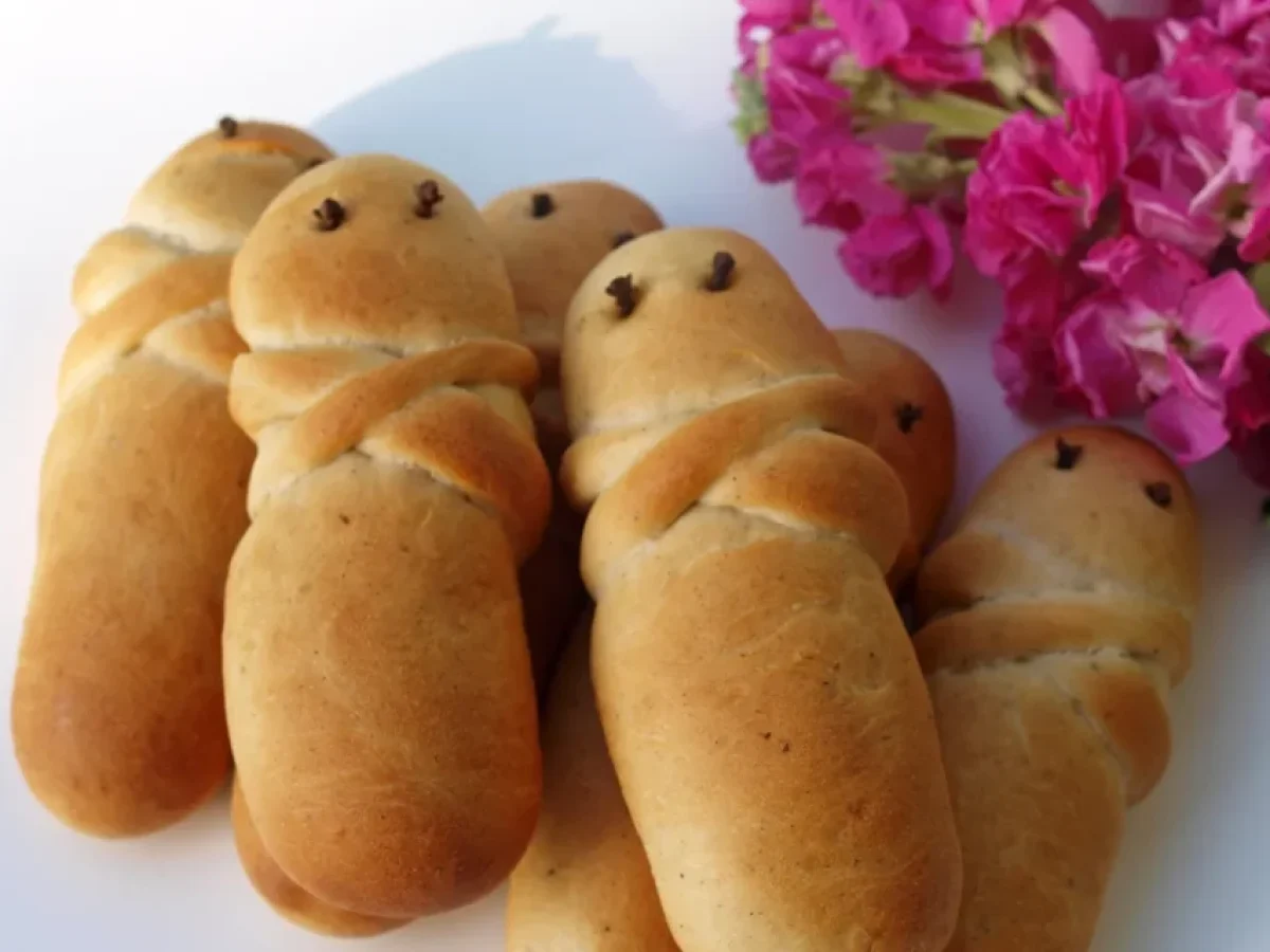 Μπήγουμε τα γαρύφαλλα για ματάκια, στόμα και στα χέρια τους και τα αφήνουμε να «ξεκουραστούν» για περίπου μια ώρα περίπου, σε αντικολλητικό χαρτί στη λαμαρίνα του φούρνου μέσα σε προθερμασμένο φούρνο στους 50 βαθμούς. Αμέσως μετά, τα τοποθετούμε με σχετική απόσταση μεταξύ τους γιατί απλώνουν λίγο. Ψήνουμε στους 180 βαθμούς για 20 λεπτά στις αντιστάσεις σε μεσαία σχάρα. Μόλις τα αποσύρουμε από το φούρνο και τα αφήνουμε να κρυώσουν για να σφίξουν λίγο.