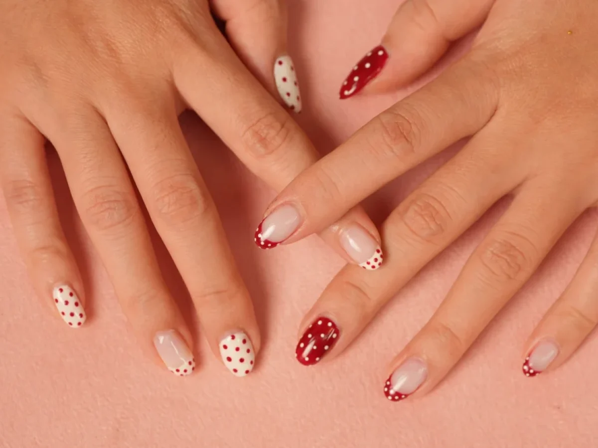 Για εσάς που αγαπάτε το κόκκινο, μπορείτε να κάνετε ένα κόκκινο γαλλικό και να σχηματίσετε λευκές βούλες πάνω της, για να πετύχετε ένα κοριτσίστικο και ρετρό nail look.