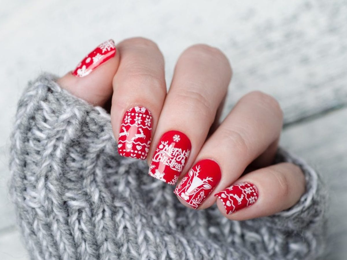 Πρόκειται για το τέλειο χρωματικό combo για τα γιορτινά σας μανικιούρ. Βάψτε τη βάση των νυχιών σας με ένα κόκκινο βερνίκι με glitter και σχεδιάστε από πάνω μικρές λευκές χιονονιφάδες.